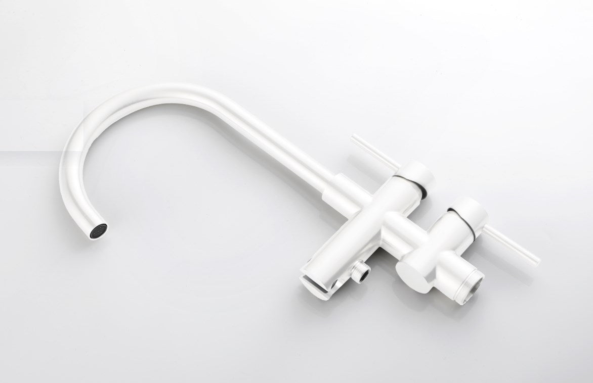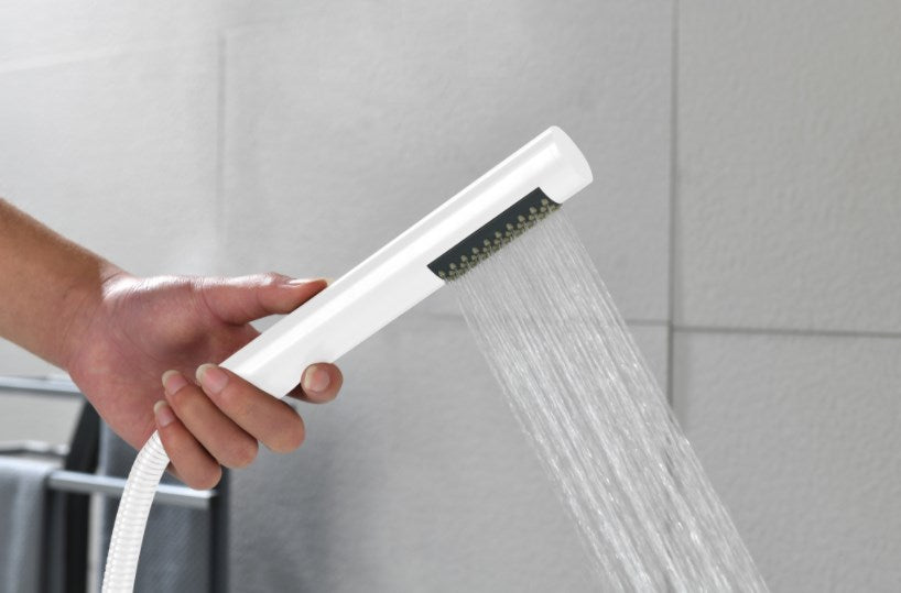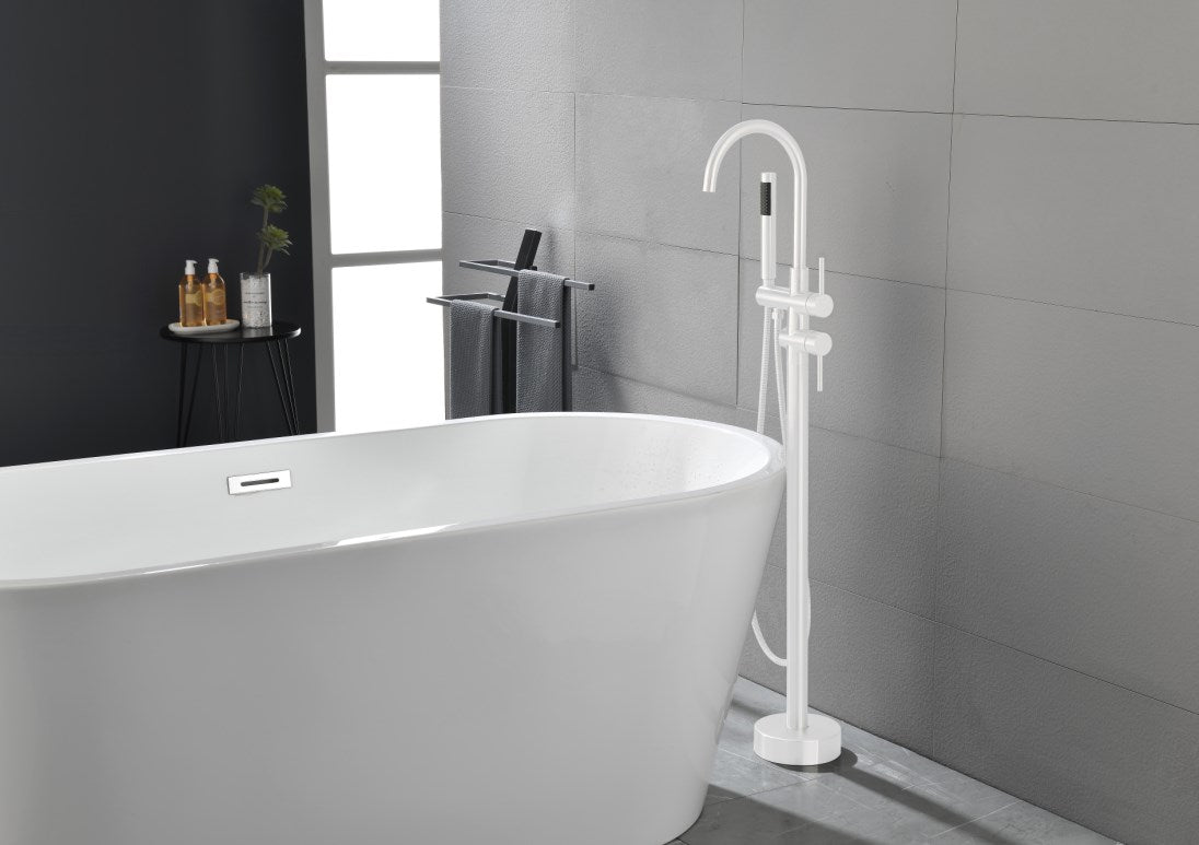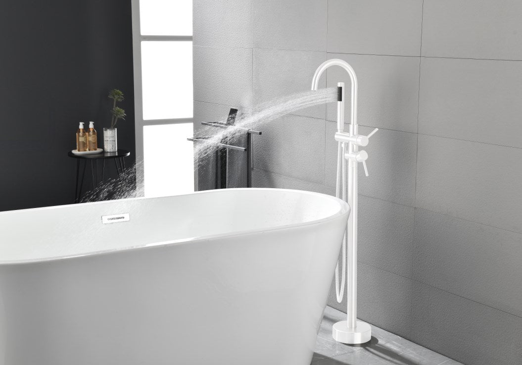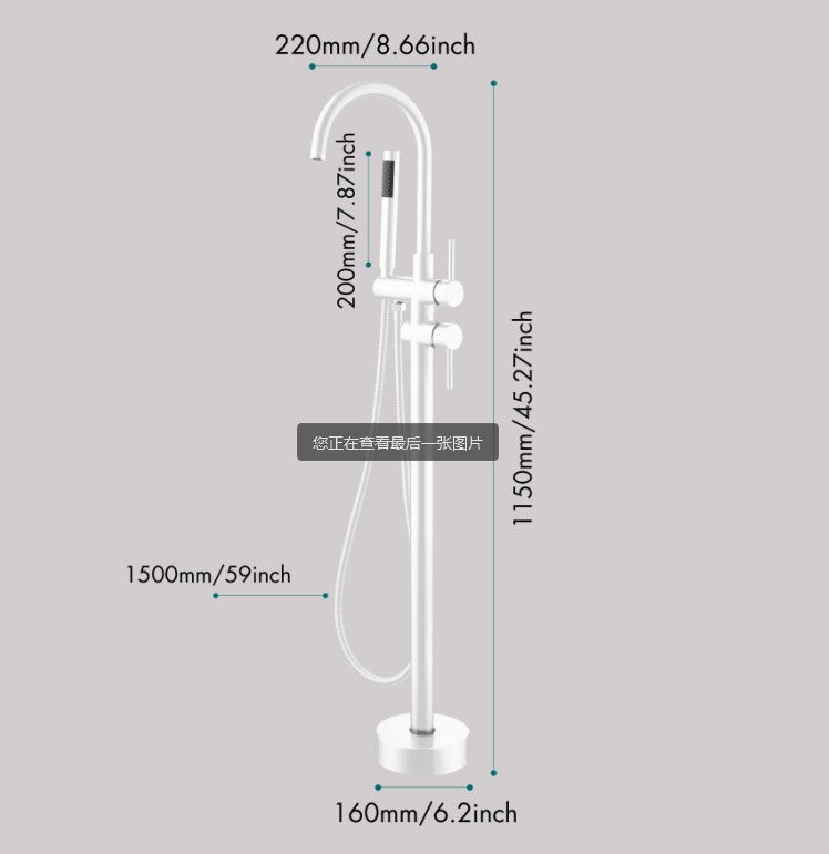 Floor Mount Bathtub Faucet Freestanding Tub Filler Standing High Flow Shower Faucets Shower Mixer Taps Swivel Gooseneck Spout with Cylinder Handheld    cFunctions This stand alone tub faucet has 360 Degree Swivel Spout, Handheld Shower with 59"(150cm) shower hose will help to rinse down the tub or rinse off after a bath,very convenient to clean.Come with a diverter knob, switch between tub spout and hand shower    Installation Floor mounted, Include all the installation hardware.Come with 1/2 thread water lines (3/8 thread adapter and 1 pair 8 inch extension water hoses in package for different need).