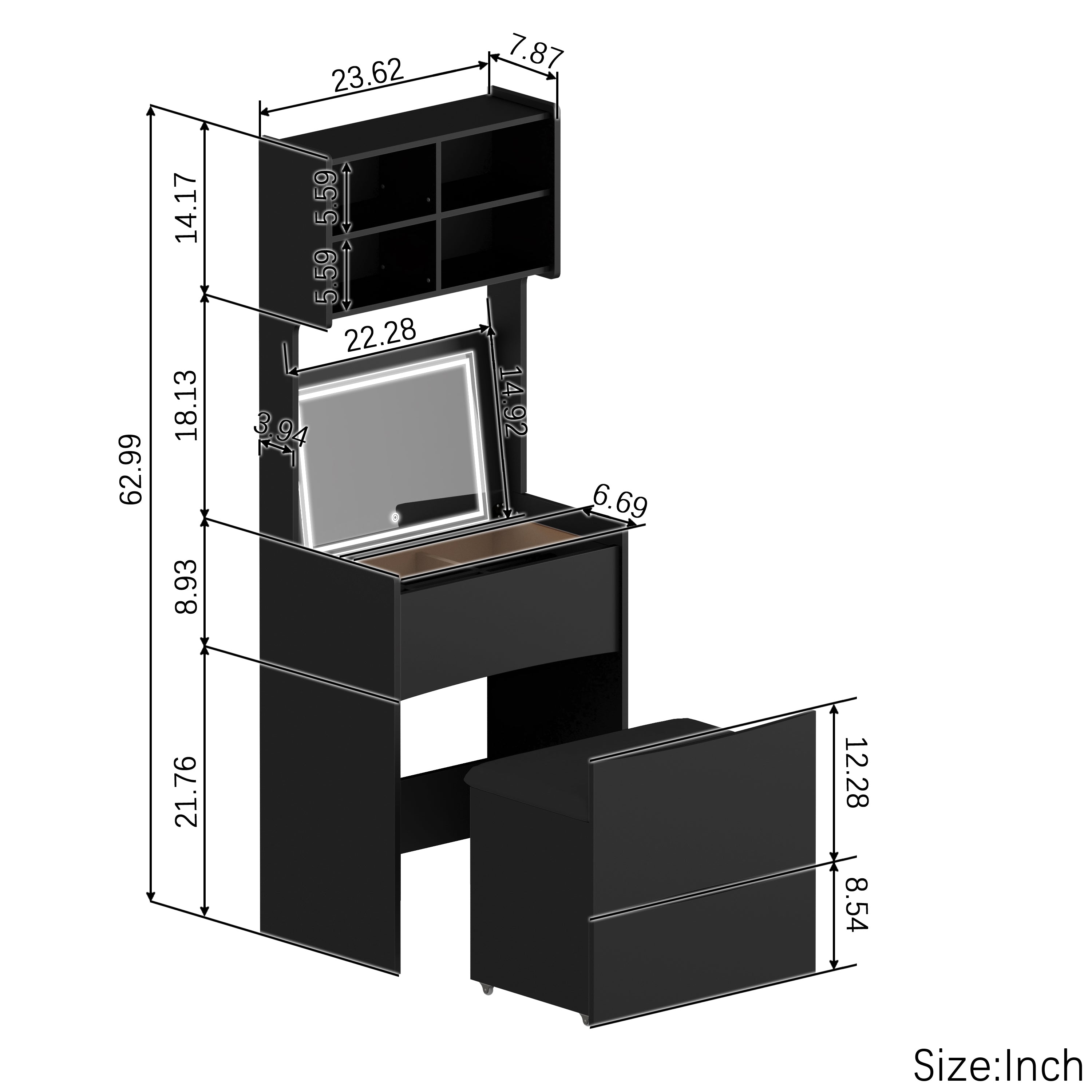 • 4.Plenty of Storage Space:The top of this dresser has 4 compartments and the tabletop is equipped with 6 storage organisers, which can sort different items in an orderly way. With the hidden stool storage area, it provides a large storage space for more items. Whether it's jewellery, perfume, make-up brushes, skincare bottles or other items, you'll find the right storage unit.