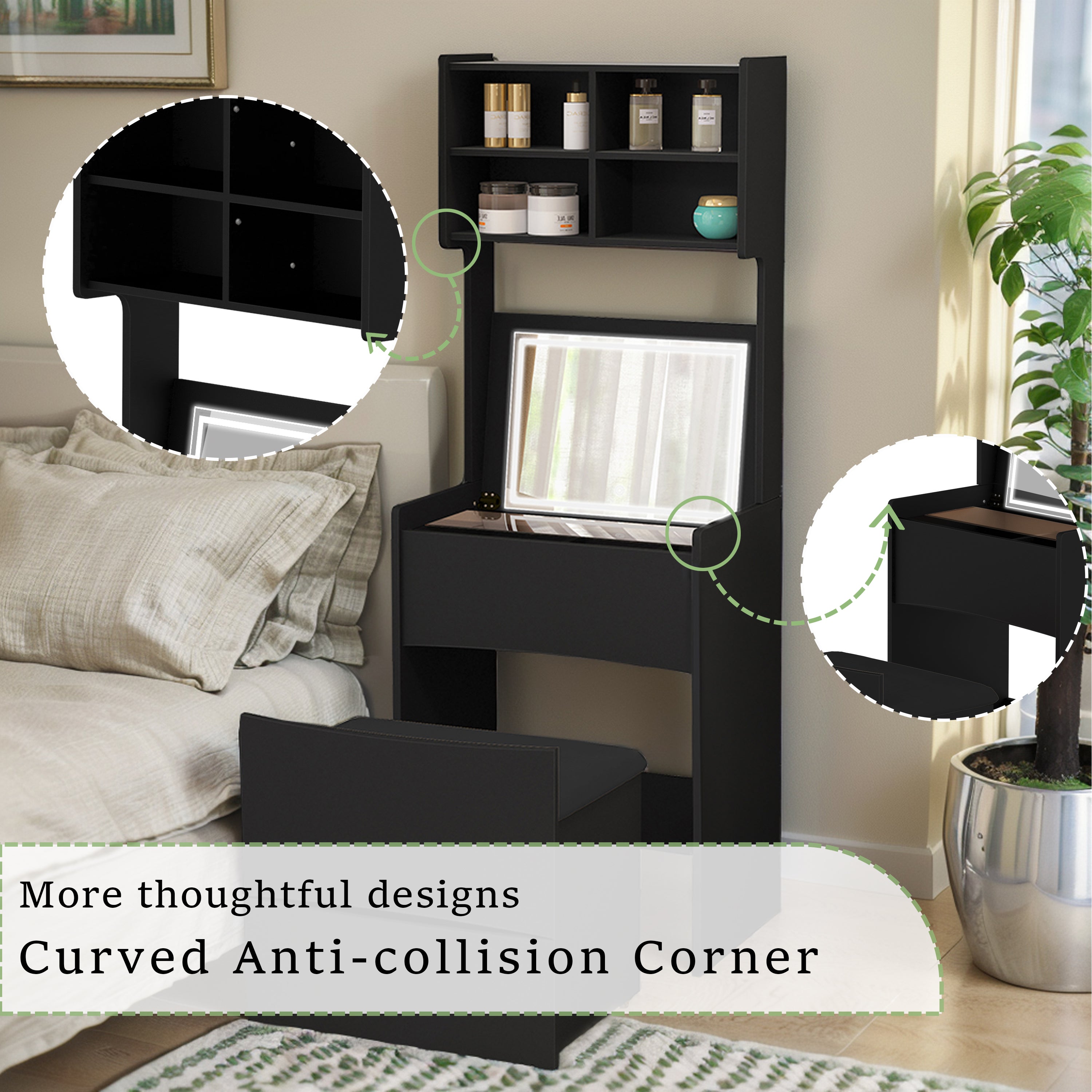 • 1.Flip LED Light Mirror:The mirror of this dressing table is equipped with 3-colour LED smart dimmer strip at the corners,just by touching the sensor switch on the screen,the light will be on,you can easily switch between white,warm and natural light to meet different make-up and skincare needs.